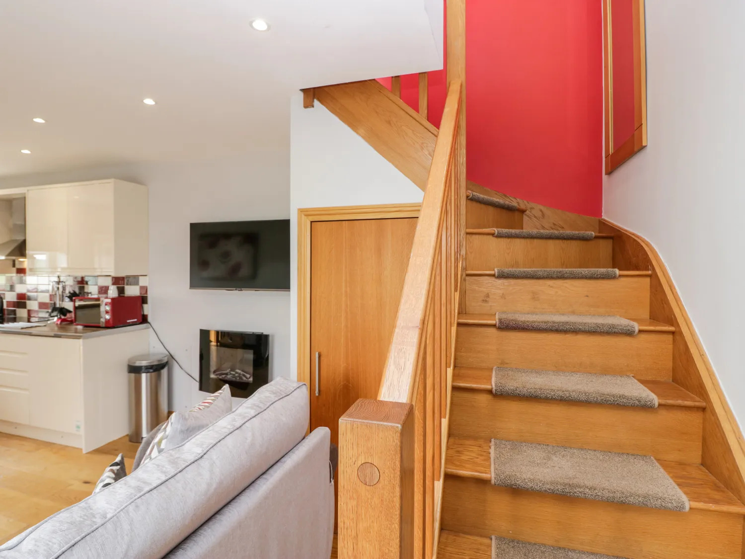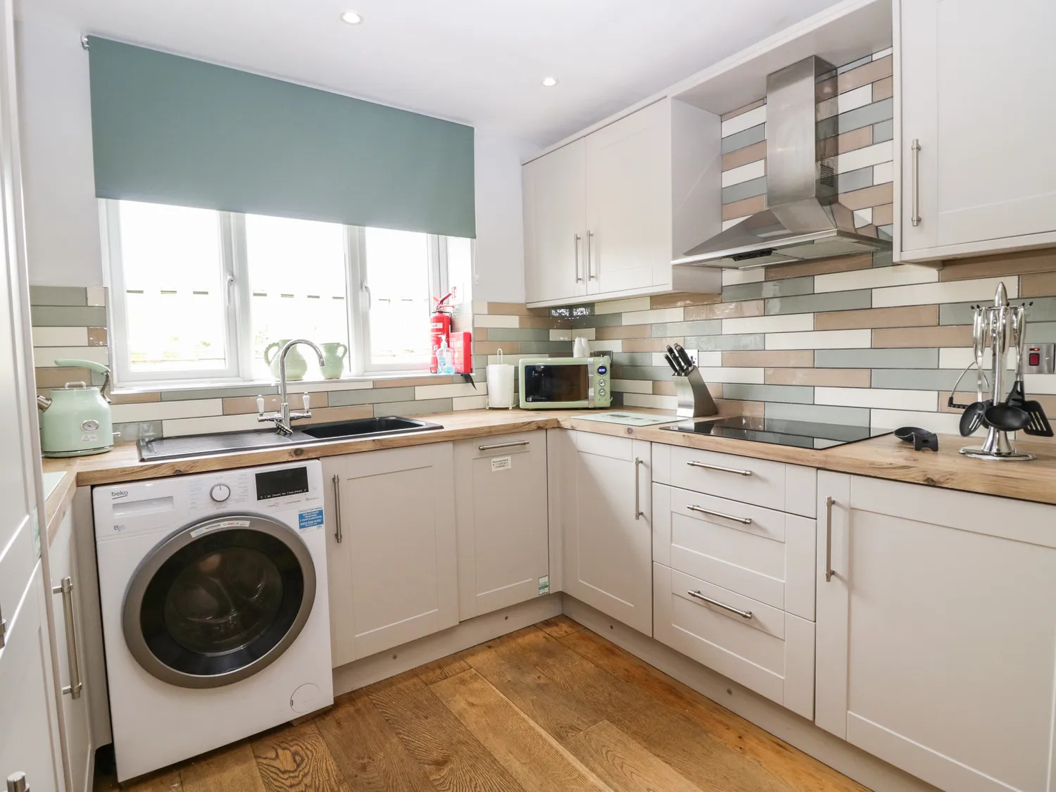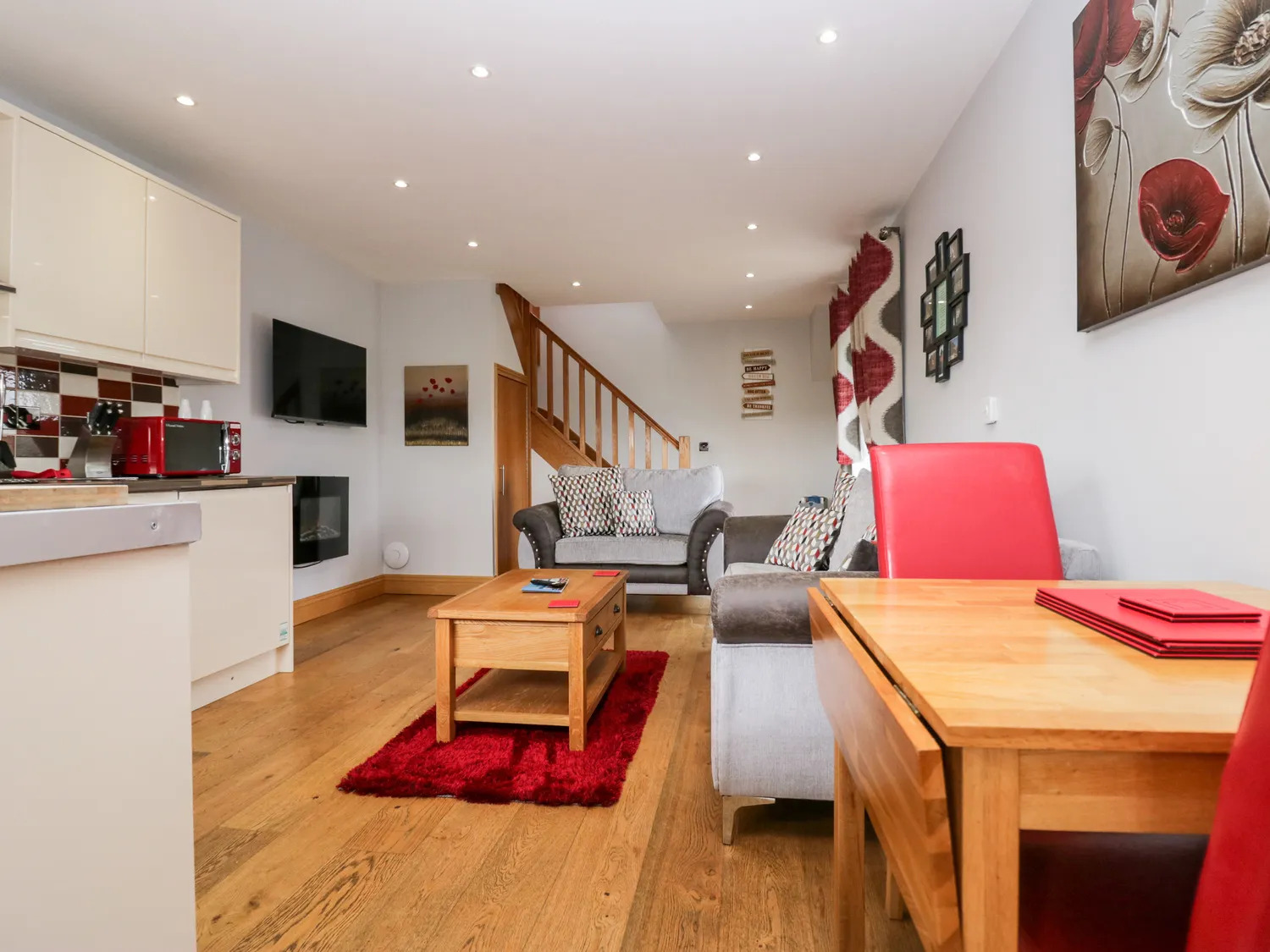 The ground floor is fitted with oak flooring, plaster painted walls and ceiling incorporating recessed spot LED lighting and the kitchen is fitted to a modern standard with wall and floor mounted units, tile splashback, integral electric oven and hob with stainless steel extractor above, sink and drainer and plumbing for washing machine and dishwasher. There are double doors leading to a side garden and hot tub.