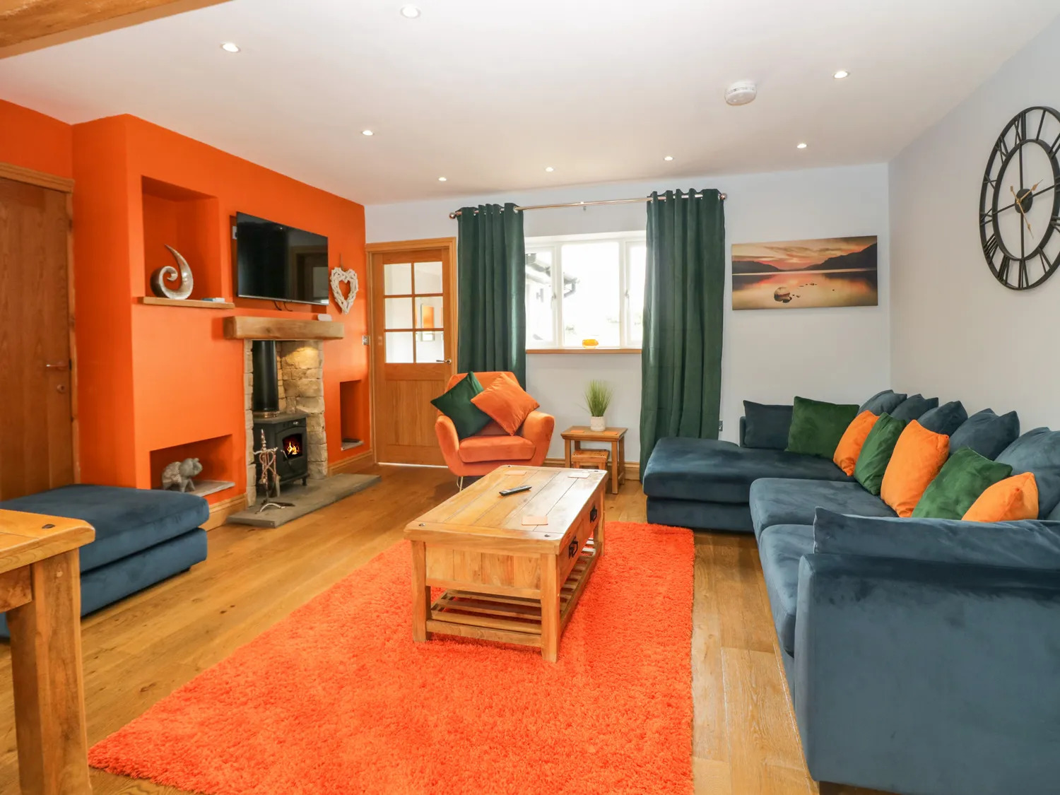 The ground floor is fitted with oak flooring, plaster painted walls and ceilings with recessed LED spotlighting and the kitchen has modern wall and floor mounted units, integral electric oven with hob and stainless-steel extractor above, sink and drainer, tile splashback and plumbing for washing machine and dishwasher. The living area has a feature stone hearth with multi-fuel burner and there are double doors leading out to the rear garden and hot tub.