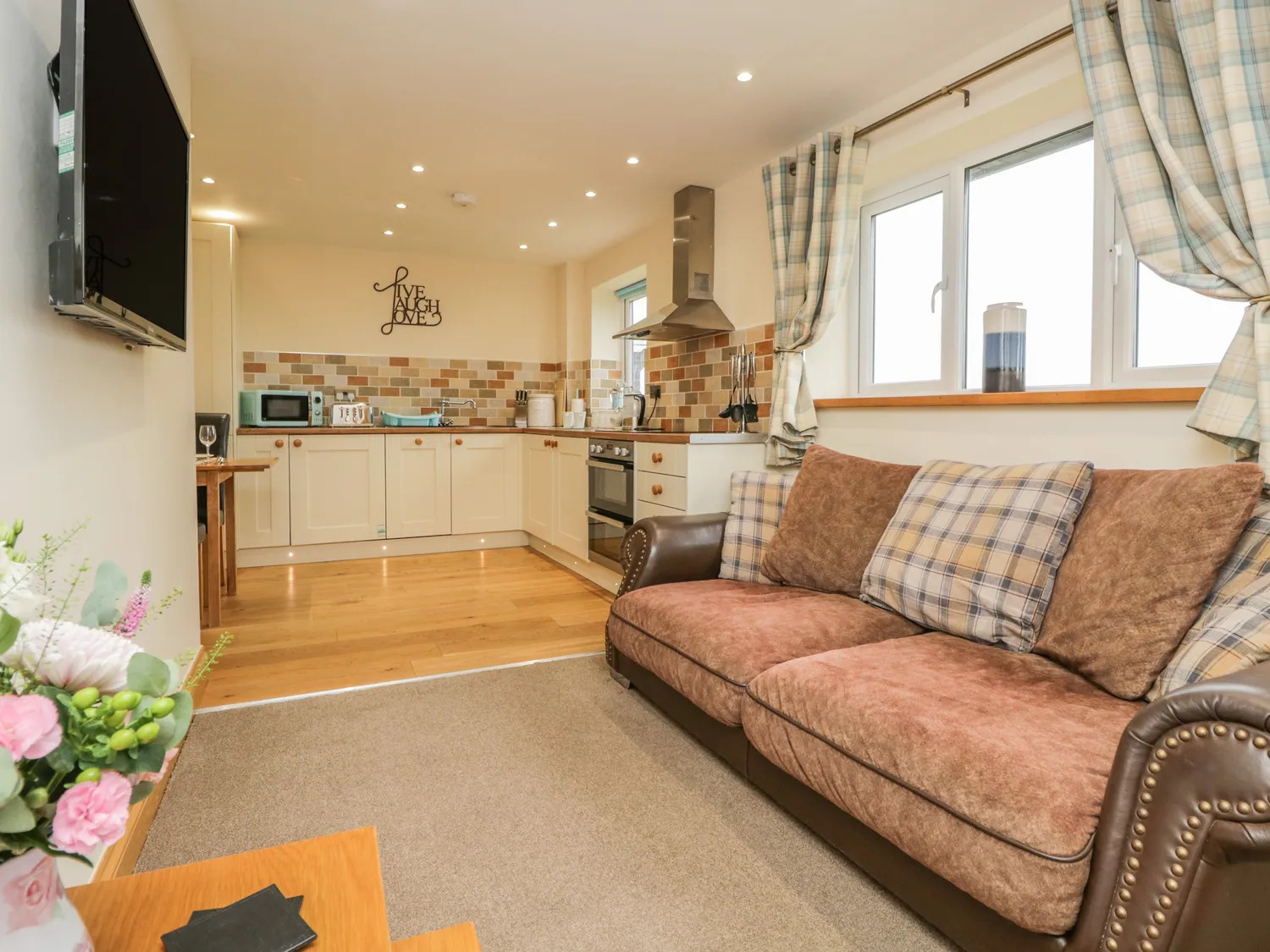 The living area has carpeted flooring, plaster painted walls and ceiling, recessed downlighting, wall mounted TV point and leads through to the kitchen/diner which has wood effect laminate flooring, a range of modern floor mounted units, tile splashback, integral electric oven with hob and extractor above, sink and drainer, integral fridge freezer and slimline dishwasher.