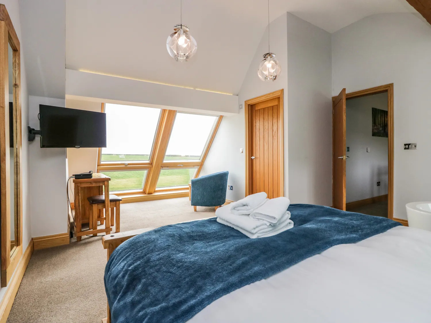 At first floor, the bedroom is mostly carpeted with a part tiled area where there is a freestanding bath adjacent to a full height window with panoramic outlook over Morecambe Bay, plaster painted walls/ceilings, exposed oak trusses and suspended lighting. The en-suite has a tile floor, walk-in shower, WC and wash hand basin.