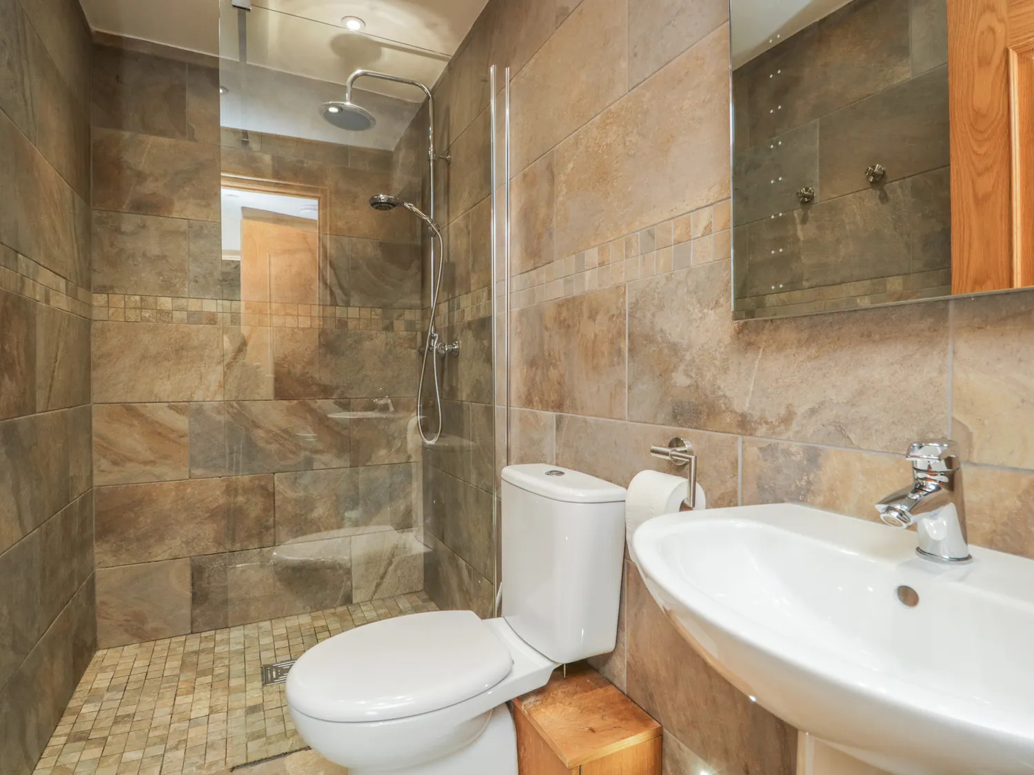 The bedroom is a good-sized double, fitted out to a similar modern standard with double doors to side garden and hot tub and has an en-suite shower room with tile flooring and walls, walk-in shower, WC, wash hand basin and chrome towel rail.